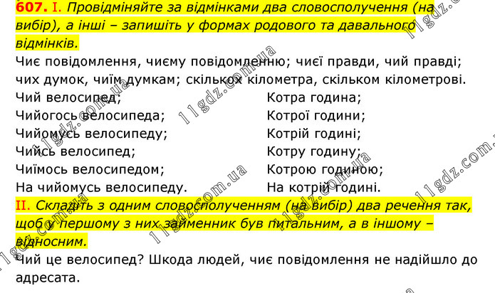 І. Провідміняйте за відмінками два словосполучення (на вибір), а інші – запишіть у формах родового та давального відмінків. Чиє повідомлення, чиєму повідомленню; чиєї правди, чий правді; чих думок, чиїм думкам; скількох кілометра, скільком кілометрові. Чий велосипед; Чийогось велосипеда; Чийомусь велосипеду; Чийсь велосипед; Чиїмось велосипедом; На чийомусь велосипеду. Котра година; Котрої години; Котрій годині; Котру годину; Котрою годиною; На котрій годині. II. Складіть з одним словосполученням (на вибір) два речення так, щоб у першому з них займенник був питальним, а в іншому – відносним. Чий це велосипед? Шкода людей, чиє повідомлення не надійшло до адресата.