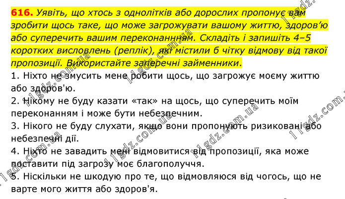 Уявіть, що хтось з однолітків або дорослих пропонує вам зробити щось таке, що може загрожувати вашому життю, здоров’ю або суперечить вашим переконаннням. Складіть і запишіть 4–5 коротких висловлень (реплік), які містили б чітку відмову від такої пропозиції. Використайте заперечні займенники. 1. Ніхто не змусить мене робити щось, що загрожує моєму життю або здоров'ю. 2. Нікому не буду казати «так» на щось, що суперечить моїм переконанням і може бути небезпечним. 3. Нікого не буду слухати, якщо вони пропонують ризиковані або небезпечні дії. 4. Ніхто не завадить мені відмовитися від пропозиції, яка може поставити під загрозу моє благополуччя. 5. Ніскільки не шкодую про те, що відмовляюся від чогось, що не варте мого життя або здоров'я.