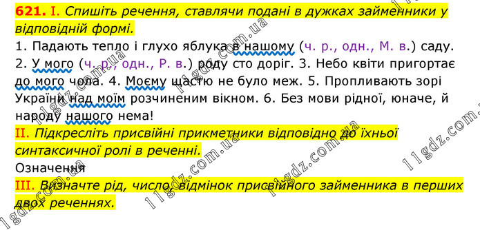 І. Спишіть речення, ставлячи подані в дужках займенники у відповідній формі. 1. Падають тепло і глухо яблука в нашому (ч. р., одн., М. в.) саду. 2. У мого (ч. р., одн., Р. в.) роду сто доріг. 3. Небо квіти пригортає до мого чола. 4. Моєму щастю не було меж. 5. Пропливають зорі України над моїм розчиненим вікном. 6. Без мови рідної, юначе, й народу нашого нема! II. Підкресліть присвійні прикметники відповідно до їхньої синтаксичної ролі в реченні. Означення ІІІ. Визначте рід, число, відмінок присвійного займенника в перших двох реченнях.
