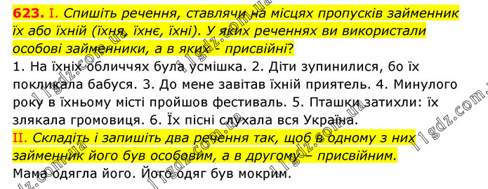 І. Спишіть речення, ставлячи на місцях пропусків займенник їх або їхній (їхня, їхнє, їхні). У яких реченнях ви використали особові займенники, а в яких - присвійні? 1. На їхніх обличчях була усмішка. 2. Діти зупинилися, бо їх покликала бабуся. 3. До мене завітав їхній приятель. 4. Минулого року в їхньому місті пройшов фестиваль. 5. Пташки затихли: їх злякала громовиця. 6. Їх пісні слухала вся Україна. II. Складіть і запишіть два речення так, щоб в одному з них займенник його був особовим, а в другому – присвійним. Мама одягла його. Його одяг був мокрим.
