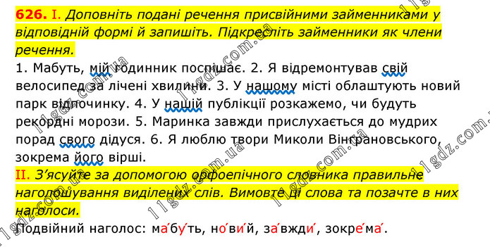 І. Доповніть подані речення присвійними займенниками у відповідній формі й запишіть. Підкресліть займенники як члени речення. 1. Мабуть, мій годинник поспішає. 2. Я відремонтував свій велосипед за лічені хвилини. 3. У нашому місті облаштують новий парк відпочинку. 4. У нашій публікції розкажемо, чи будуть рекордні морози. 5. Маринка завжди прислухається до мудрих порад свого дідуся. 6. Я люблю твори Миколи Вінграновського, зокрема його вірші. II. З’ясуйте за допомогою орфоепічного словника правильне наголошування виділених слів. Вимовте ці слова та позачте в них наголоси. Подвійний наголос: ма՛бу՛ть, но՛ви՛й, за՛вжди՛, зокре՛ма՛.