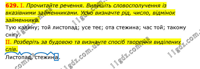 І. Прочитайте речення. Випишіть словосполучення із вказівними займенниками. Усно визначте рід, число, відмінок займенника. Тую калину; той листопад; усе теє; ота стежина; час той; такому снігу. II. Розберіть за будовою та визначте спосіб творення виділених слів. Листопад, стежина.