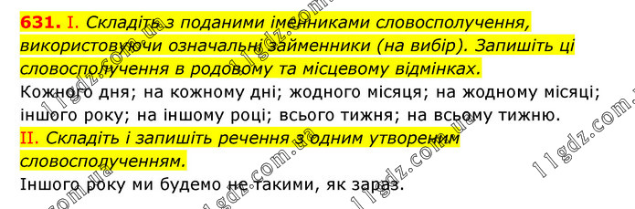 І. Складіть з поданими іменниками словосполучення, використовуючи означальні займенники (на вибір). Запишіть ці словосполучення в родовому та місцевому відмінках. Кожного дня; на кожному дні; жодного місяця; на жодному місяці; іншого року; на іншому році; всього тижня; на всьому тижню. II. Складіть і запишіть речення з одним утвореним словосполученням. Іншого року ми будемо не такими, як зараз.