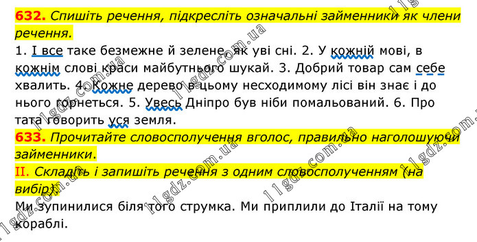 632. Спишіть речення, підкресліть означальні займенники як члени речення. 1. І все таке безмежне й зелене, як уві сні. 2. У кожній мові, в кожнім слові краси майбутнього шукай. 3. Добрий товар сам себе хвалить. 4. Кожне дерево в цьому несходимому лісі він знає і до нього горнеться. 5. Увесь Дніпро був ніби помальований. 6. Про тата говорить уся земля. 633. Прочитайте словосполучення вголос, правильно наголошуючи займенники. II. Складіть і запишіть речення з одним словосполученням (на вибір). Ми зупинилися біля того струмка. Ми приплили до Італії на тому кораблі.