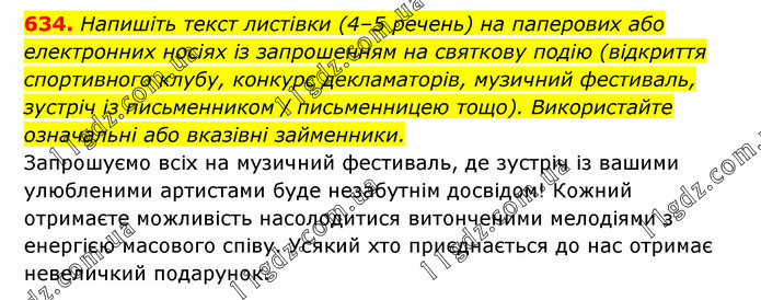 Напишіть текст листівки (4–5 речень) на паперових або електронних носіях із запрошенням на святкову подію (відкриття спортивного клубу, конкурс декламаторів, музичний фестиваль, зустріч із письменником / письменницею тощо). Використайте означальні або вказівні займенники. Запрошуємо всіх на музичний фестиваль, де зустріч із вашими улюбленими артистами буде незабутнім досвідом! Кожний отримаєте можливість насолодитися витонченими мелодіями з енергією масового співу. Усякий хто приєднається до нас отримає невеличкий подарунок.