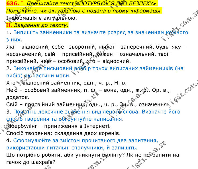 І. Прочитайте текст «ПОТУРБУЙСЯ ПРО БЕЗПЕКУ». Поміркуйте, чи актуальною є подана в ньому інформація. Інформація є актуальною. II. Завдання до тексту. 1. Випишіть займенники та визначте розряд за значенням кожного з них. Які – відносний, себе– зворотній, ніякої – заперечний, будь–яку – неозначений, свій – присвійний, кожен – означальний, твої – присвійний, нею – особовий, хто – відносний. 2. Виконайте письмовий розбір трьох виписаних займенників (на вибір) як частини мови. Хто – відносний займенник, одн., ч. р., Н. в. Нею – особовий займенник, п. ф. – вона, одн., ж. р., Ор. в., додаток. Свій – присвійний займенник, одн., ч. р., Зн. в., означення. 3. Поясніть лексичне значення виділеного слова. Визначте його спосіб творення та обґрунтуйте написання. Кібербулінг – приниження в Інтернеті. Спосіб творення: складання двох коренів. 4. Сформулюйте за змістом прочитаного два запитання, використавши питальні сполучники, й запишіть. Що потрібно робити, аби уникнути булінгу? Як не потрапити на гачок до шахраїв?