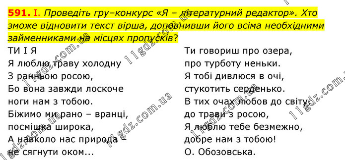 І. Проведіть гру–конкурс «Я – літературний редактор». Хто зможе відновити текст вірша, доповнивши його всіма необхідними займенниками на місцях пропусків? ТИ І Я Я люблю траву холодну З ранньою росою, Бо вона завжди лоскоче ноги нам з тобою. Біжимо ми рано – вранці, посмішка широка, А навколо нас природа – не сягнути оком... Ти говориш про озера, про турботу неньки. Я тобі дивлюся в очі, стукотить серденько. В тих очах любов до світу, до трави з росою, Я люблю тебе безмежно, добре нам з тобою! О. Обозовська.