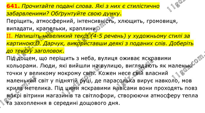 Прочитайте подані слова. Які з них є стилістично забарвленими? Обґрунтуйте свою думку. Періщить, атмосферний, інтенсивність, хлющить, громовиця, випадати, крапельки, краплини. II. Напишіть невеликий текст (4-5 речень) у художньому стилі за картиною О. Дарчук, використавши деякі з поданих слів. Доберіть до тексту заголовок. Під дощем, що періщить з неба, вулиця оживає яскравими кольорами. Люди, які вийшли на вулицю, виглядають як маленькі точки у великому мокрому світі. Кожен несе свій власний маленький світ у піднятій руці, де парасолька вирує навколо, мов крила метелика. Під цими яскравими навісами вони проходять повз мокрі вітрини магазинів та світлофори, створюючи атмосферу тепла та захоплення в середині дощового дня.