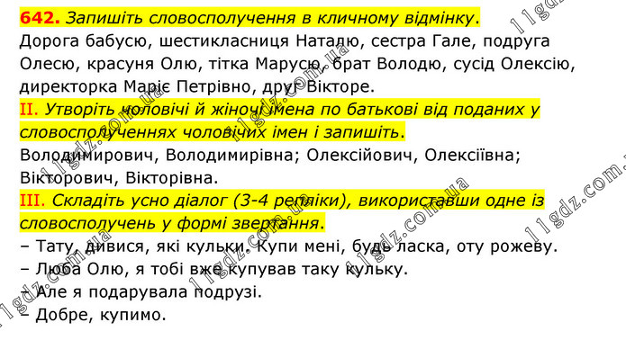 Запишіть словосполучення в кличному відмінку. Дорога бабусю, шестикласниця Наталю, сестра Гале, подруга Олесю, красуня Олю, тітка Марусю, брат Володю, сусід Олексію, директорка Маріє Петрівно, друг Вікторе. II. Утворіть чоловічі й жіночі імена по батькові від поданих у словосполученнях чоловічих імен і запишіть. Володимирович, Володимирівна; Олексійович, Олексіївна; Вікторович, Вікторівна. ІІІ. Складіть усно діалог (3-4 репліки), використавши одне із словосполучень у формі звертання. – Тату, дивися, які кульки. Купи мені, будь ласка, оту рожеву. – Люба Олю, я тобі вже купував таку кульку. – Але я подарувала подрузі. – Добре, купимо.