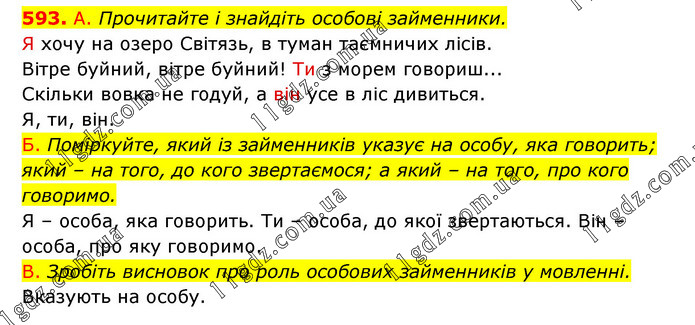 А. Прочитайте і знайдіть особові займенники. Я хочу на озеро Світязь, в туман таємничих лісів. Вітре буйний, вітре буйний! Ти з морем говориш... Скільки вовка не годуй, а він усе в ліс дивиться. Я, ти, він. Б. Поміркуйте, який із займенників указує на особу, яка говорить; який – на того, до кого звертаємося; а який – на того, про кого говоримо. Я – особа, яка говорить. Ти – особа, до якої звертаються. Він – особа, про яку говоримо. В. Зробіть висновок про роль особових займенників у мовленні. Вказують на особу.