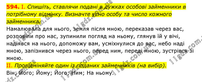 І. Спишіть, ставлячи подані в дужках особові займенники в потрібному відмінку. Визначте усно особу та число кожного займенника. Намалювала для нього, земля після мною, переказав через вас, розповіли про нас, зупинили погляд на ньому, глянув їй у вічі, надіявся на нього, допоможу вам, усміхнулися до вас, небо наді мною, запізнився через нього, перед ним, переді мною, зустрівся зі мною. II. Провідміняйте один із поданих займенників (на вибір). Він; Його; Йому; Його; Ним; На ньому.