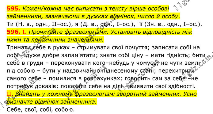 595. Кожен/кожна має виписати з тексту вірша особові займенники, зазначаючи в дужках відмінок, число й особу. Ти (Н. в., одн., ІІ–ос.), я (Д. в., одн., І–ос.), її (Зн. в., одн., І–ос.). 596. І. Прочитайте фразеологізми. Установіть відповідність між ними та лексичними значеннями. Тримати себе в руках – стримувати свої почуття; записати собі на лобі – дуже добре запам'ятати; знати собі ціну – мати гідність; бити себе в груди – переконувати кого–небудь у чомусь; не чути землі під собою – бути у надзвичайно піднесеному стані; перехитрити самого себе – помилися в розрахунках; говорить сам за себе –не потребує доказів; показати себе на ділі – виявити свої здібності. II. Знайдіть у кожному фразеологізмі зворотний займенник. Усно визначте відмінок займенника. Себе, свої, собі, собою.