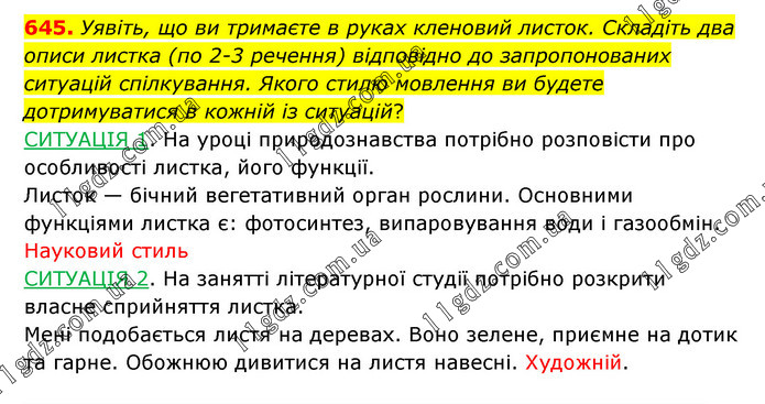 Уявіть, що ви тримаєте в руках кленовий листок. Складіть два описи листка (по 2-3 речення) відповідно до запропонованих ситуацій спілкування. Якого стилю мовлення ви будете дотримуватися в кожній із ситуацій? СИТУАЦІЯ 1. На уроці природознавства потрібно розповісти про особливості листка, його функції. Листок — бічний вегетативний орган рослини. Основними функціями листка є: фотосинтез, випаровування води і газообмін. Науковий стиль СИТУАЦІЯ 2. На занятті літературної студії потрібно розкрити власне сприйняття листка. Мені подобається листя на деревах. Воно зелене, приємне на дотик та гарне. Обожнюю дивитися на листя навесні. Художній.