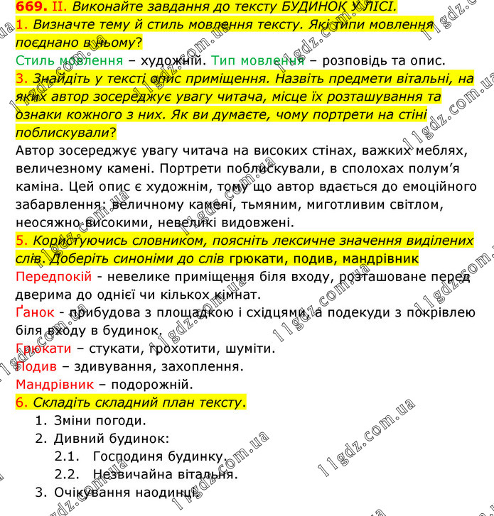 ІІ. Виконайте завдання до тексту БУДИНОК У ЛІСІ. 1. Визначте тему й стиль мовлення тексту. Які типи мовлення поєднано в ньому? Стиль мовлення – художній. Тип мовлення – розповідь та опис. 3. Знайдіть у тексті опис приміщення. Назвіть предмети вітальні, на яких автор зосереджує увагу читача, місце їх розташування та ознаки кожного з них. Як ви думаєте, чому портрети на стіні поблискували? Автор зосереджує увагу читача на високих стінах, важких меблях, величезному камені. Портрети поблискували, в сполохах полум’я каміна. Цей опис є художнім, тому що автор вдається до емоційного забарвлення: величному камені, тьмяним, миготливим світлом, неосяжно високими, невеликі видовжені. 5. Користуючись словником, поясніть лексичне значення виділених слів. Доберіть синоніми до слів грюкати, подив, мандрівник Передпокій - невелике приміщення біля входу, розташоване перед дверима до однієї чи кількох кімнат. Ґанок - прибудова з площадкою і східцями, а подекуди з покрівлею біля входу в будинок. Грюкати – стукати, грохотити, шуміти. Подив – здивування, захоплення. Мандрівник – подорожній. 6. Складіть складний план тексту. 1. Зміни погоди. 2. Дивний будинок: 2.1. Господиня будинку. 2.2. Незвичайна вітальня. 3. Очікування наодинці.