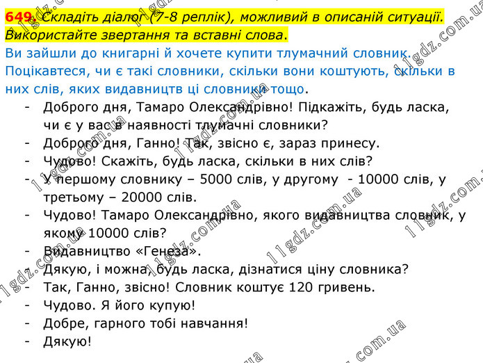 Складіть діалог (7-8 реплік), можливий в описаній ситуації. Використайте звертання та вставні слова. Ви зайшли до книгарні й хочете купити тлумачний словник. Поцікавтеся, чи є такі словники, скільки вони коштують, скільки в них слів, яких видавництв ці словники тощо. - Доброго дня, Тамаро Олександрівно! Підкажіть, будь ласка, чи є у вас в наявності тлумачні словники? - Доброго дня, Ганно! Так, звісно є, зараз принесу. - Чудово! Скажіть, будь ласка, скільки в них слів? - У першому словнику – 5000 слів, у другому - 10000 слів, у третьому – 20000 слів. - Чудово! Тамаро Олександрівно, якого видавництва словник, у якому 10000 слів? - Видавництво «Генеза». - Дякую, і можна, будь ласка, дізнатися ціну словника? - Так, Ганно, звісно! Словник коштує 120 гривень. - Чудово. Я його купую! - Добре, гарного тобі навчання! - Дякую!