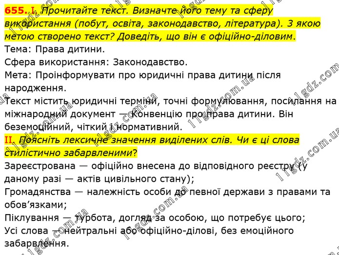 І. Прочитайте текст. Визначте його тему та сферу використання (побут, освіта, законодавство, література). 3 якою метою створено текст? Доведіть, що він є офіційно-діловим. Тема: Права дитини. Сфера використання: Законодавство. Мета: Проінформувати про юридичні права дитини після народження. Текст містить юридичні терміни, точні формулювання, посилання на міжнародний документ — Конвенцію про права дитини. Він беземоційний, чіткий і нормативний. ІІ. Поясніть лексичне значення виділених слів. Чи є ці слова стилістично забарвленими? Зареєстрована — офіційно внесена до відповідного реєстру (у даному разі — актів цивільного стану); Громадянства — належність особи до певної держави з правами та обов’язками; Піклування — турбота, догляд за особою, що потребує цього; Усі слова — нейтральні або офіційно-ділові, без емоційного забарвлення.