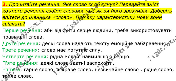 Прочитайте речення. Яке слово їх об'єднує? Передайте зміст кожного речення своїми словами так, як ви його зрозуміли. Доберіть епітети до іменника «слово». Про яку характеристику мови вони свідчать? Перше речення: аби відкрити серце людини, треба використовувати правильні слова. Друге речення: деякі слова надають тексту емоційне забарвлення. Третє речення: слово має могутню силу. Четверте речення: рідна мова є наймилішою серцю. П'яте речення: деякі слова здатні заспокоїти. Епітети: гарне слово, яскраве слово, незвичайне слово , рідне слово, тепле слово.