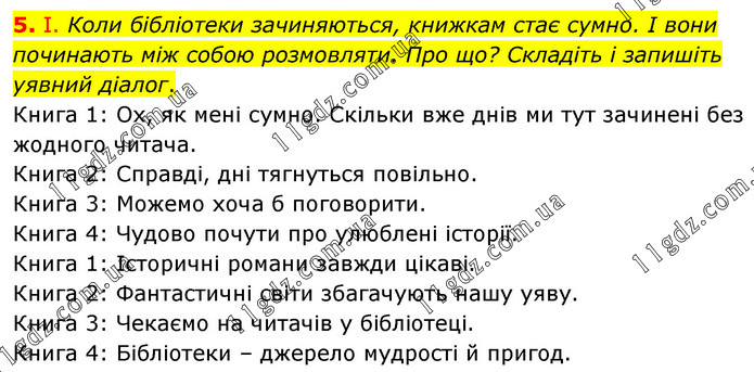 І. Коли бібліотеки зачиняються, книжкам стає сумно. І вони починають між собою розмовляти. Про що? Складіть і запишіть уявний діалог. Книга 1: Ох, як мені сумно. Скільки вже днів ми тут зачинені без жодного читача. Книга 2: Справді, дні тягнуться повільно. Книга 3: Можемо хоча б поговорити. Книга 4: Чудово почути про улюблені історії. Книга 1: Історичні романи завжди цікаві. Книга 2: Фантастичні світи збагачують нашу уяву. Книга 3: Чекаємо на читачів у бібліотеці. Книга 4: Бібліотеки – джерело мудрості й пригод.