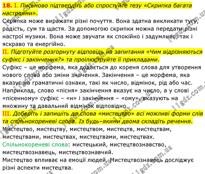 І. Письмово підтвердіть або спростуйте тезу «Скрипка багата настроями». Скрипка може виражати різні почуття. Вона здатна викликати тугу, радість, сум та щастя. За допомогою скрипки можна передати різні настрої музики. Вона може звучати як спокійно і задумливо, так і яскраво та енергійно. ІІ. Підготуйте розгорнуту відповідь на запитання «Чим відрізняються суфікс і закінчення?» та проілюструйте її прикладами. Суфікс – це морфема, яка додається до кореня слова для утворення нового слова або зміни значення. Закінчення – це морфема, яка вказує на граматичні ознаки, такі як число, відмінок, рід або час. Наприклад, слово «пісня» закінчення вказує на число, а у слові «пісенному» суфікс – «н» і закінчення – «ому», вказують на множину та давальний відмінок відповідно. ІІІ. Доберіть і запишіть до слова «мистецтво» всі можливі форми слів та спільнокореневі слова. Із будь–якими двома складіть речення. Мистецтво, мистецтву, мистецтвом, мистецтв, мистецтвам, мистецтвами, мистецтвах, мистецтвами, мистецтвах. Спільнокореневі слова: мистецький, мистецтвознавство, мистецтвознавець, мистецтвознавчий. Мистецтво впливає на емоції людей. Мистецтвознавець досліджує різні аспекти мистецтва.