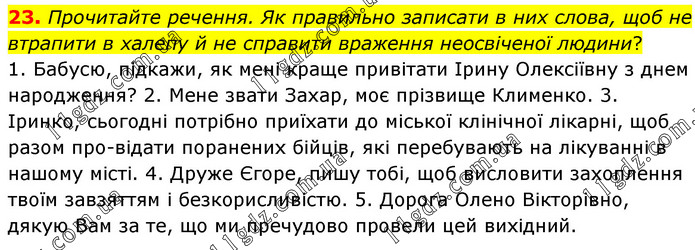 Прочитайте речення. Як правильно записати в них слова, щоб не втрапити в халепу й не справити враження неосвіченої людини? 1. Бабусю, підкажи, як мені краще привітати Ірину Олексіївну з днем народження? 2. Мене звати Захар, моє прізвище Клименко. 3. Іринко, сьогодні потрібно приїхати до міської клінічної лікарні, щоб разом провідати поранених бійців, які перебувають на лікуванні в нашому місті. 4. Друже Єгоре, пишу тобі, щоб висловити захоплення твоїм завзяттям і безкорисливістю. 5. Дорога Олено Вікторівно, дякую Вам за те, що ми пречудово провели цей вихідний.