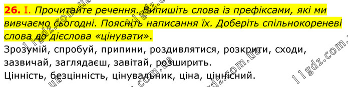 І. Прочитайте речення. Випишіть слова із префіксами, які ми вивчаємо сьогодні. Поясніть написання їх. Доберіть спільнокореневі слова до дієслова «цінувати». Зрозумій, спробуй, припини, роздивлятися, розкрити, сходи, зазвичай, заглядаєш, завітай, розширить. Цінність, безцінність, цінувальник, ціна, ціннісний.