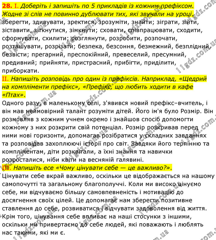 І. Доберіть і запишіть по 5 прикладів із кожним префіксом. Жодне зі слів не повинно дублювати тих, які звучали на уроці. зберегти, здивувати, зректися, зрозуміти, знайти; зіграти, зійти, зіставити, зіткнутися, зімкнути; сховати, співпрацювати, сходити, сформувати, схилити; розглянути, розробити, розпочати, розташувати, розрізати; безпека, безсоння, безмежний, безплідний, безвісти; прегарний, преспокійний, превеселий, пресумний, предивний; прийняти, пристрасний, прибігти, приділити, приборкати. ІІ. Напишіть розповідь про один із префіксів. Наприклад, «Щедрий на компліменти префікс», «Префікс, що любить ходити в кафе «Птах». Одного разу, в маленькому селі, з'явився новий префікс–вчитель, і він мав неймовірний талант розуміти дітей. Його ім'я було Розмір. Він розмовляв з кожним учнем окремо і знайшов спосіб допомогти кожному з них розкрити свій потенціал. Розмір розкривав перед ними нові горизонти, допомагав розібратися у складних завданнях та розповідав захоплюючі історії про світ. Завдяки його терпінню та компліментам, діти розквітали, а їхні знання та навички розросталися, ніби квіти на весняній галявині. ІІІ. Напишіть есе «Чому цінувати себе — це важливо?». Цінувати себе вкрай важливо, оскільки це відображається на нашому самопочутті та загальному благополуччі. Коли ми високо цінуємо себе, ми відчуваємо більшу самовпевненість і мотивацію до досягнення своїх цілей. Це допомагає нам зберегти позитивне ставлення до себе, розвиватися і відчувати задоволення від життя. Крім того, цінування себе впливає на наші стосунки з іншими, оскільки ми привертаємо до себе людей, які поважають і люблять нас такими, які ми є.