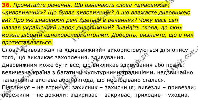 Прочитайте речення. Що означають слова «дивовижа», «дивовижний»? Що буває дивовижним? А що вважаєте дивовижею ви? Про які дивовижні речі йдеться в реченнях? Чому весь світ назвав український народ дивовижний? Знайдіть слова, до яких можна дібрати однокореневі антоніми. Доберіть, визначте, що в них протиставляється. Слова «дивовижа» та «дивовижний» використовуються для опису того, що викликає захоплення, здивування. Дивовижним може бути все, що викликає здивування або подив: величезна країна з багатими культурними традиціями, надзвичайно талановита вистава або пригода, що несподівано сталася. Підтримує – не втримує; захисник – захисниця; вивезли – привезли; пережили – не дожили; відкриває – закриває; приходив – уходив.