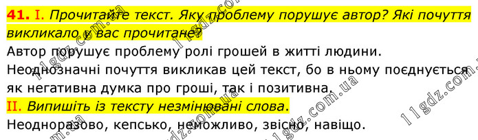 І. Прочитайте текст. Яку проблему порушує автор? Які почуття викликало у вас прочитане? Автор порушує проблему ролі грошей в житті людини. Неоднозначні почуття викликав цей текст, бо в ньому поєднується як негативна думка про гроші, так і позитивна. ІІ. Випишіть із тексту незмінювані слова. Неодноразово, кепсько, неможливо, звісно, навіщо.