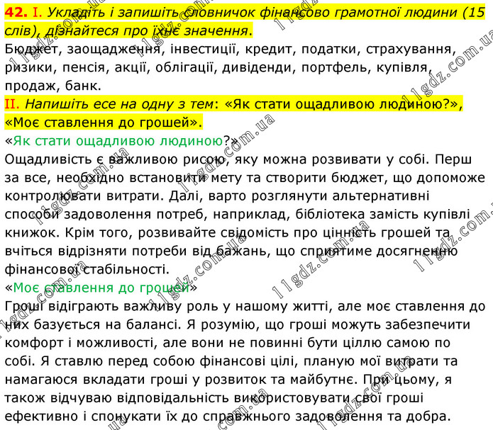 І. Укладіть і запишіть словничок фінансово грамотної людини (15 слів), дізнайтеся про їхнє значення. Бюджет, заощадження, інвестиції, кредит, податки, страхування, ризики, пенсія, акції, облігації, дивіденди, портфель, купівля, продаж, банк. ІІ. Напишіть есе на одну з тем: «Як стати ощадливою людиною?», «Моє ставлення до грошей». «Як стати ощадливою людиною?» Ощадливість є важливою рисою, яку можна розвивати у собі. Перш за все, необхідно встановити мету та створити бюджет, що допоможе контролювати витрати. Далі, варто розглянути альтернативні способи задоволення потреб, наприклад, бібліотека замість купівлі книжок. Крім того, розвивайте свідомість про цінність грошей та вчіться відрізняти потреби від бажань, що сприятиме досягненню фінансової стабільності. «Моє ставлення до грошей» Гроші відіграють важливу роль у нашому житті, але моє ставлення до них базується на балансі. Я розумію, що гроші можуть забезпечити комфорт і можливості, але вони не повинні бути ціллю самою по собі. Я ставлю перед собою фінансові цілі, планую мої витрати та намагаюся вкладати гроші у розвиток та майбутнє. При цьому, я також відчуваю відповідальність використовувати свої гроші ефективно і спонукати їх до справжнього задоволення та добра.