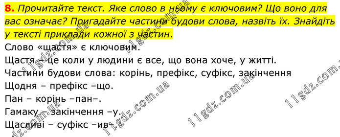Прочитайте текст. Яке слово в ньому є ключовим? Що воно для вас означає? Пригадайте частини будови слова, назвіть їх. Знайдіть у тексті приклади кожної з частин. Слово «щастя» є ключовим. Щастя – це коли у людини є все, що вона хоче, у житті. Частини будови слова: корінь, префікс, суфікс, закінчення Щодня – префікс –що. Пан – корінь –пан–. Гамаку – закінчення –у. Щасливі – суфікс –ив–.
