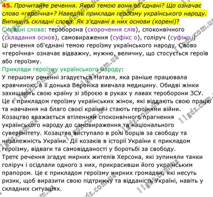 Прочитайте речення. Якою темою вони об'єднані? Що означає слово «героїчна»? Наведіть приклади героїзму українського народу. Випишіть складні слова. Як з'єднані в них основи (корені)? Складні слова: тероборона (скорочення слів), споконвічного (складання основ), самовираження (суфікс о), голіруч (суфікс і) Ці речення об'єднані темою героїзму українського народу. Слово «героїчна» означає відважну, мужню, величну, що стосується героїв або героїзму. Приклади героїзму українського народу: У першому реченні згадується Наталя, яка раніше працювала кравчиною, а її донька Вероніка вивчала медицину. Обидві жінки захищають свою країну зі зброєю в руках у лавах тероборони ЗСУ. Це є прикладом героїзму українських жінок, які віддають свою працю та навчання на благо своєї країни і стають героїнями війни. Козацтво вважається втіленням споконвічного прагнення українського народу до самовираження та національного суверенітету. Козацтво виступало в ролі борців за свободу та незалежність України. Дії козаків в історії України є прикладом героїзму, відваги та самовідданості у боротьбі за свободу. Третє речення згадує мирних жителів Херсона, які зупиняли танки голіруч і осідлали одного з них, прикрасивши його українським прапором. Це є прикладом героїзму мирних громадян, які несуть ризик, щоб виразити свою підтримку та відданість Україні, навіть у складних ситуаціях.
