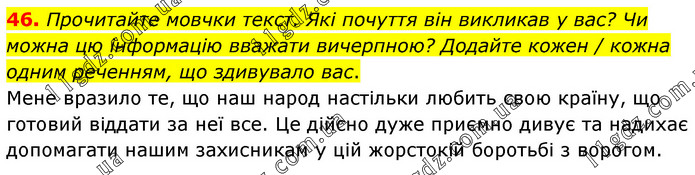 Прочитайте мовчки текст. Які почуття він викликав у вас? Чи можна цю інформацію вважати вичерпною? Додайте кожен / кожна одним реченням, що здивувало вас. Мене вразило те, що наш народ настільки любить свою країну, що готовий віддати за неї все. Це дійсно дуже приємно дивує та надихає допомагати нашим захисникам у цій жорстокій боротьбі з ворогом.