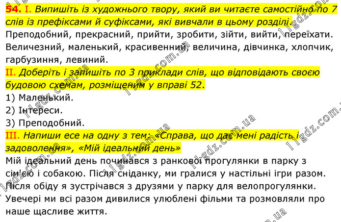 І. Випишіть із художнього твору, який ви читаєте самостійно по 7 слів із префіксами й суфіксами, які вивчали в цьому розділі. Преподобний, прекрасний, прийти, зробити, зійти, вийти, переїхати. Величезний, маленький, красивенний, величина, дівчинка, хлопчик, гарбузиння, левиний. ІІ. Доберіть і запишіть по 3 приклади слів, що відповідають своєю будовою схемам, розміщеним у вправі 52. 1) Маленький. 2) Інтереси. 3) Преподобний. ІІІ. Напиши есе на одну з тем: «Справа, що дає мені радість і задоволення», «Мій ідеальний день» Мій ідеальний день починався з ранкової прогулянки в парку з сім'єю і собакою. Після сніданку, ми гралися у настільні ігри разом. Після обіду я зустрічався з друзями у парку для велопрогулянки. Увечері ми всі разом дивилися улюблені фільми та розмовляли про наше щасливе життя.
