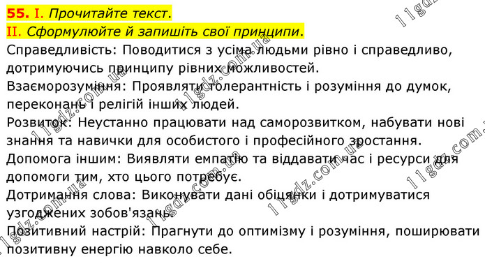І. Прочитайте текст. ІІ. Сформулюйте й запишіть свої принципи. Справедливість: Поводитися з усіма людьми рівно і справедливо, дотримуючись принципу рівних можливостей. Взаєморозуміння: Проявляти толерантність і розуміння до думок, переконань і релігій інших людей. Розвиток: Неустанно працювати над саморозвитком, набувати нові знання та навички для особистого і професійного зростання. Допомога іншим: Виявляти емпатію та віддавати час і ресурси для допомоги тим, хто цього потребує. Дотримання слова: Виконувати дані обіцянки і дотримуватися узгоджених зобов'язань. Позитивний настрій: Прагнути до оптимізму і розуміння, поширювати позитивну енергію навколо себе.