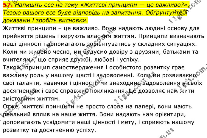 Напишіть есе на тему «Життєві принципи — це важливо?». Тезою вашого есе буде відповідь на запитання. Обґрунтуйте її доказами і зробіть висновки. Життєві принципи – це важливо. Вони надають людині основу для прийняття рішень і керують власним життям. Принципи визначають наші цінності і допомагають зорієнтуватись у складних ситуаціях. Коли ми живемо чесно, ми будуємо довіру з друзями, батьками та вчителями, що сприяє дружбі, любові і успіху. Також, принцип самоствердження і особистого розвитку грає важливу роль у нашому щасті і задоволенні. Коли ми розвиваємо свої таланти, навички і цінності, ми знаходимо задоволення у своїх досягненнях і своє справжнє покликання. Це дозволяє нам жити змістовним життям. Отже, життєві принципи не просто слова на папері, вони мають реальний вплив на наше життя. Вони надають нам орієнтири, допомагають усвідомити наші цінності і мету, і сприяють нашому розвитку та досягненню успіху.
