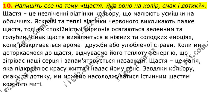 Напишіть есе на тему «Щастя. Яке воно на колір, смак і дотик?». Щастя – це незліченні відтінки кольору, що малюють усмішки на обличчях. Яскраві та теплі відтінки червоного викликають палке щастя, тоді як спокійність і гармонія осягаються зеленним та голубим. Смак щастя виявляється в ніжних та солодких емоціях, коли розкривається аромат дружби або улюбленої страви. Коли ми доторкаємося до щастя, відчуваємо його теплоту і енергію, що зігріває наші серця і запам'ятовується назавжди. Щастя – це магія, яка підкреслює красу життя і надає йому сенс. Завдяки кольору, смаку та дотику, ми можемо насолоджуватися істинним щастям кожного миті.