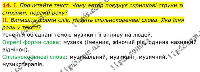 І. Прочитайте текст. Чому автор поєднує скрипкові струни зі стихіями, порами року? ІІ. Випишіть форми слів. Назвіть спільнокореневі слова. Яка їхня роль у тексті? Речення об'єднані темою музики і її впливу на людей. Окремі форми слова: музика (іменник, жіночий рід, однина називний відмінок). Спільнокореневі слова: музикальний, музикант, музичний, музикотерапія.