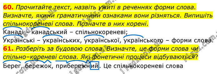 60. Прочитайте текст, назвіть ужиті в реченнях форми слова. Визначте, якими граматичними ознаками вони різняться. Випишіть спільнокореневі слова. Позначте в них корені. Канаді – канадський – спільнокореневі; Українські – українських, української, українського – форми слова. 61. Розберіть за будовою слова. Визначте, це форми слова чи спільно–кореневі слова. Які фонетичні процеси відбуваються? Берег, бережок, прибережний. Це спільнокореневі слова