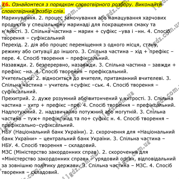 Ознайомтеся з порядком словотвірного розбору. Виконайте словотвірний розбір слів. Маринування. 2. процес замочування або намацування харчових продуктів у спеціальному маринаді для покращення смаку та м'якості. 3. Спільна частина – марин + суфікс –ува і –нн. 4. Спосіб творення – суфіксальний Перехід. 2. дія або процес переміщення з одного місця, стану, режиму або ситуації до іншого. 3. Спільна частина – хід + префікс –пере. 4. Спосіб творення – префіксальний. Назавжди. 2. безперервно, назавжди. 3. Спільна частина – завжди + префікс –на. 4. Спосіб творення – префіксальний. Учительська. 2. відноситься до вчителя, притаманний вчителеві. 3. Спільна частина – учитель +суфікс –ськ. 4. Спосіб творення – суфіксальний. Прехитрий. 2. дуже розумний або витончений у хитрості. 3. Спільна частина – хитр + префікс –пре. 4. Спосіб творення – префіксальний. Надпотужний. 2. надзвичайно потужний або могутній. 3. Спільна частина – туж+ префікс над та по+ суфікс н. 4. Спосіб творення – префіксально–суфіксальний. НБУ (Національний банк України). 2. скорочення для «Національний банк України» – центральний банк України. 3. Спільна частина – НБУ. 4. Спосіб творення – складовий. МЗС (Міністерство закордонних справ). 2. скорочення для «Міністерство закордонних справ» – урядовий орган, відповідальний за зовнішню політику держави. 3. Спільна частина – МЗС. 4. Спосіб творення – складовий.