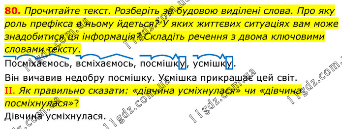 Прочитайте текст. Розберіть за будовою виділені слова. Про яку роль префікса в ньому йдеться? У яких життєвих ситуаціях вам може знадобитися ця інформація? Складіть речення з двома ключовими словами тексту. Посміхаємось, всміхаємось, посмішку, усмішку. Він вичавив недобру посмішку. Усмішка прикрашає цей світ. ІІ. Як правильно сказати: «дівчина усміхнулася» чи «дівчина посміхнулася»? Дівчина усміхнулася.
