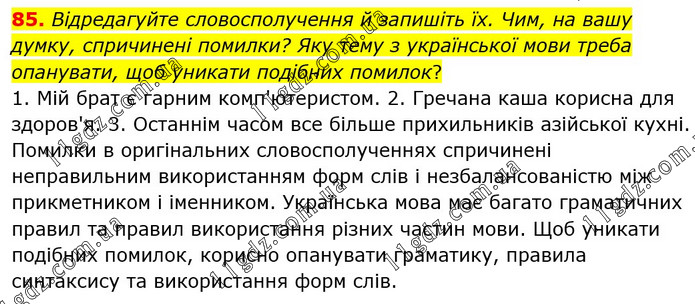 Відредагуйте словосполучення й запишіть їх. Чим, на вашу думку, спричинені помилки? Яку тему з української мови треба опанувати, щоб уникати подібних помилок? 1. Мій брат є гарним комп'ютеристом. 2. Гречана каша корисна для здоров'я. 3. Останнім часом все більше прихильників азійської кухні. Помилки в оригінальних словосполученнях спричинені неправильним використанням форм слів і незбалансованістю між прикметником і іменником. Українська мова має багато граматичних правил та правил використання різних частин мови. Щоб уникати подібних помилок, корисно опанувати граматику, правила синтаксису та використання форм слів.