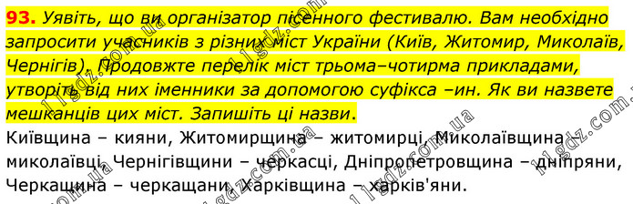 Уявіть, що ви організатор пісенного фестивалю. Вам необхідно запросити учасників з різних міст України (Київ, Житомир, Миколаїв, Чернігів). Продовжте перелік міст трьома–чотирма прикладами, утворіть від них іменники за допомогою суфікса –ин. Як ви назвете мешканців цих міст. Запишіть ці назви. Київщина – кияни, Житомирщина – житомирці, Миколаївщина – миколаївці, Чернігівщини – черкасці, Дніпропетровщина – дніпряни, Черкащина – черкащани, Харківщина – харків'яни.