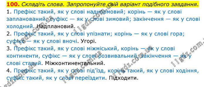 Складіть слова. Запропонуйте свій варіант подібного завдання. 1. Префікс такий, як у слові наднормовий; корінь — як у слові запланований; суфікс — як у слові зимовий; закінчення — як у слові холодний. Надплановий. 2. Префікс такий, як у слові упізнати; корінь — як у слові гора; суфікс — як у слові вночі. Угорі. 3. Префікс такий, як у слові міжміський, корінь — як у слові континенти, суфікс — як у слові розвивальний, закінчення — як у слові старий. Міжконтинентальний. 4. Префікс такий, як у слові під'їзд, корінь такий, як у слові ходіння, суфікс такий, як у слові переїздити. Підходити.