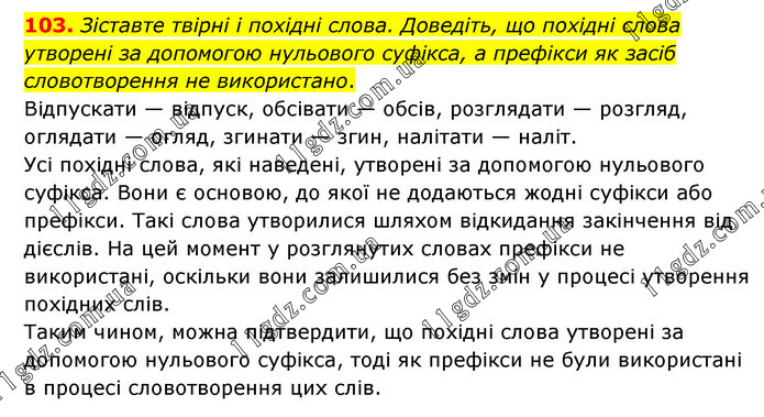 Зіставте твірні і похідні слова. Доведіть, що похідні слова утворені за допомогою нульового суфікса, а префікси як засіб словотворення не використано. Відпускати — відпуск, обсівати — обсів, розглядати — розгляд, оглядати — огляд, згинати — згин, налітати — наліт. Усі похідні слова, які наведені, утворені за допомогою нульового суфікса. Вони є основою, до якої не додаються жодні суфікси або префікси. Такі слова утворилися шляхом відкидання закінчення від дієслів. На цей момент у розглянутих словах префікси не використані, оскільки вони залишилися без змін у процесі утворення похідних слів. Таким чином, можна підтвердити, що похідні слова утворені за допомогою нульового суфікса, тоді як префікси не були використані в процесі словотворення цих слів.