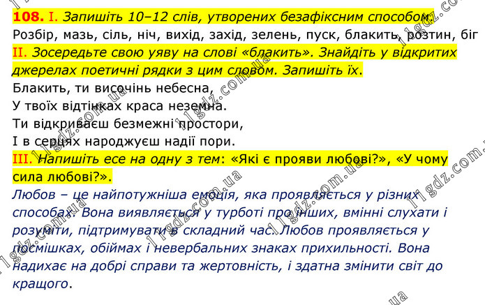 І. Запишіть 10–12 слів, утворених безафіксним способом. Розбір, мазь, сіль, ніч, вихід, захід, зелень, пуск, блакить, розтин, біг ІІ. Зосередьте свою уяву на слові «блакить». Знайдіть у відкритих джерелах поетичні рядки з цим словом. Запишіть їх. Блакить, ти височінь небесна, У твоїх відтінках краса неземна. Ти відкриваєш безмежні простори, І в серцях народжуєш надії пори. ІІІ. Напишіть есе на одну з тем: «Які є прояви любові?», «У чому сила любові?». Любов – це найпотужніша емоція, яка проявляється у різних способах. Вона виявляється у турботі про інших, вмінні слухати і розуміти, підтримувати в складний час. Любов проявляється у посмішках, обіймах і невербальних знаках прихильності. Вона надихає на добрі справи та жертовність, і здатна змінити світ до кращого.
