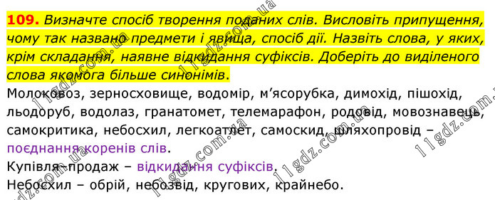 Визначте спосіб творення поданих слів. Висловіть припущення, чому так названо предмети і явища, спосіб дії. Назвіть слова, у яких, крім складання, наявне відкидання суфіксів. Доберіть до виділеного слова якомога більше синонімів. Молоковоз, зерносховище, водомір, м’ясорубка, димохід, пішохід, льодоруб, водолаз, гранатомет, телемарафон, родовід, мовознавець, самокритика, небосхил, легкоатлет, самоскид, шляхопровід – поєднання коренів слів. Купівля–продаж – відкидання суфіксів. Небосхил – обрій, небозвід, кругових, крайнебо.
