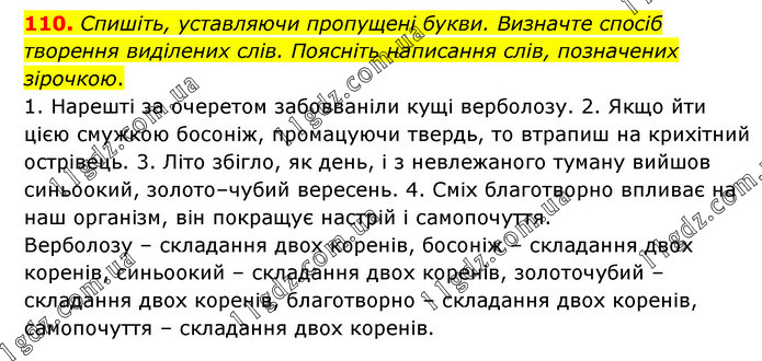 Спишіть, уставляючи пропущені букви. Визначте спосіб творення виділених слів. Поясніть написання слів, позначених зірочкою. 1. Нарешті за очеретом забовваніли кущі верболозу. 2. Якщо йти цією смужкою босоніж, промацуючи твердь, то втрапиш на крихітний острівець. 3. Літо збігло, як день, і з невлежаного туману вийшов синьоокий, золото–чубий вересень. 4. Сміх благотворно впливає на наш організм, він покращує настрій і самопочуття. Верболозу – складання двох коренів, босоніж – складання двох коренів, синьоокий – складання двох коренів, золоточубий – складання двох коренів, благотворно – складання двох коренів, самопочуття – складання двох коренів.