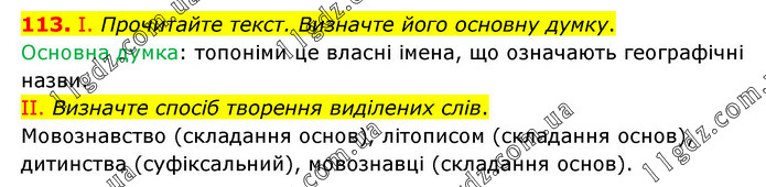 І. Прочитайте текст. Визначте його основну думку. Основна думка: топоніми це власні імена, що означають географічні назви. ІІ. Визначте спосіб творення виділених слів. Мовознавство (складання основ), літописом (складання основ), дитинства (суфіксальний), мовознавці (складання основ).