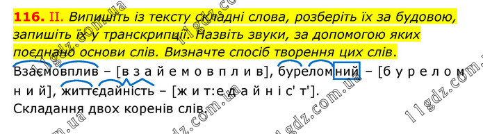 ІІ. Випишіть із тексту складні слова, розберіть їх за будовою, запишіть їх у транскрипції. Назвіть звуки, за допомогою яких поєднано основи слів. Визначте спосіб творення цих слів. Взаємовплив – [в з а й е м о в п л и в], буреломний – [б у р е л о м н и й], життєдайність – [ж и т:е д а й н і с' т']. Складання двох коренів слів.