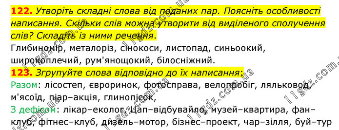 122. Утворіть складні слова від поданих пар. Поясніть особливості написання. Скільки слів можна утворити від виділеного сполучення слів? Складіть із ними речення. Глибиномір, металоріз, сінокоси, листопад, синьоокий, широкоплечий, рум'янощокий, білосніжний. 123. Згрупуйте слова відповідно до їх написання: Разом: лісостеп, євроринок, фотосправа, велопробіг, ляльковод, м'ясоїд, піар–акція, глинопісок, З дефісом: лікар–еколог, Цап–відбувайло, музей–квартира, фан–клуб, фітнес–клуб, дизель–мотор, бізнес–проект, чар–зілля, буй–тур.